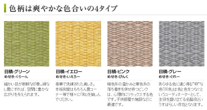 | 規格 | 畳表色:目積-グリーン、目積-イエロー、目積-ピンク、目積-グレー 重さ: 4.7Kg/枚 |