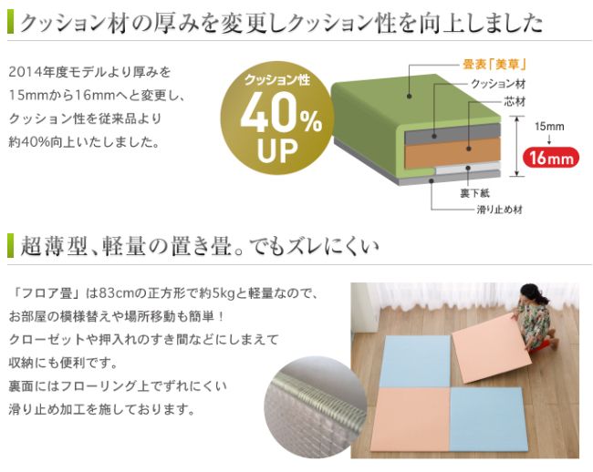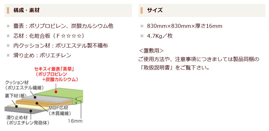 | 材質 | ■畳表:ポリプロピレン、炭酸カルシウム他 ■芯材:中密度木質繊維 圧縮版(F☆☆☆☆) ■内クッション材:ポリエステル製不織布 ■滑り止め:ポリエチレン ※アレルバスター加工 |