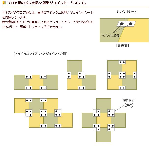 フロア畳を並べるだけで、フローリングを和室に模様替え! 「リフォームはできないけど、和室が欲しい」、「今だけ和空間にしたい」という方にオススメ。 オリジナル色・柄をはじめとする豊富なバリエーションから、お部屋のイメージにぴったりのフロア畳を見つけてください! ※畳と畳をつなぎ合わせる「簡単ジョイント・システム(止め具、ジョイントシート)」を商品に同梱しています。2枚、4枚、8枚・・・お好きな形に組み合わるのに便利です。