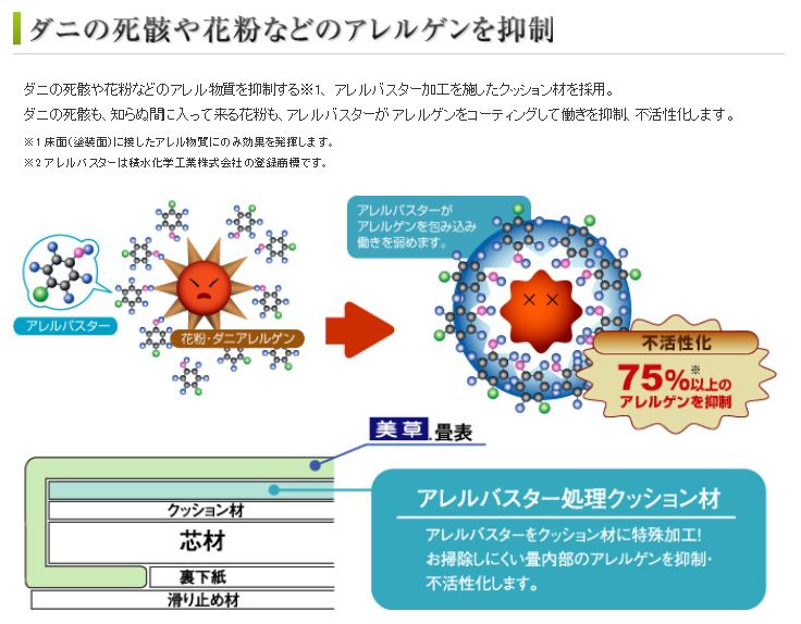アレルゲンの働きを抑制するアレルバスター加工を施したフロア畳なので、掃除機では取れにくいカーペット根本部分のアレルゲンの働きを抑えます。