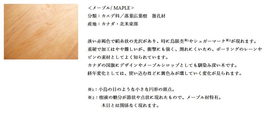 | 備考 | オイル仕上げ(メープルソープのみソープ仕上げ) 木部は、メープル材、メープル材ソープ仕上げ、ウォールナット材、オーク材、オーク材ブラウン色、チェリー材、チーク材、ウェンジ材の8種類からお選びいただけます。 |