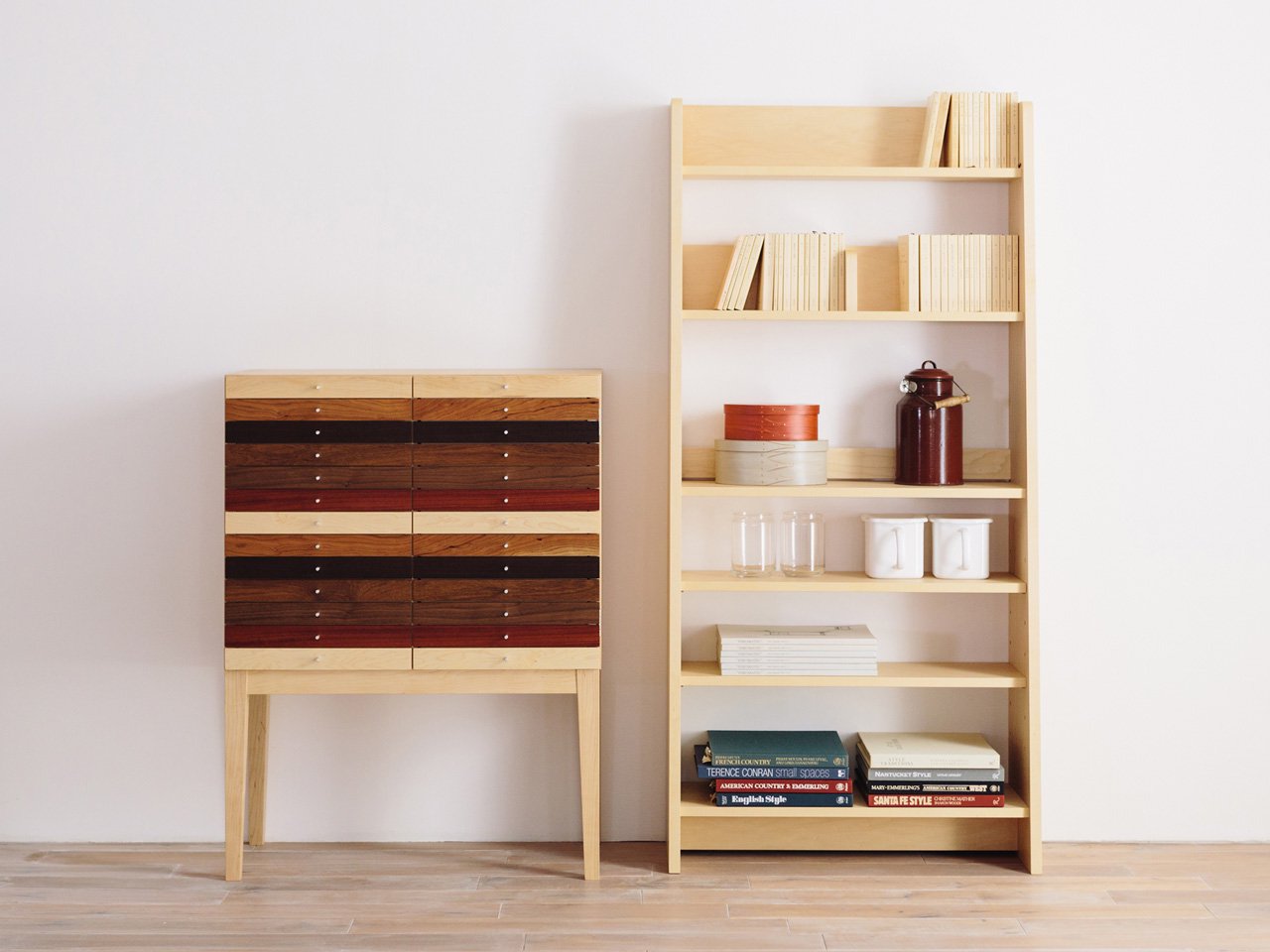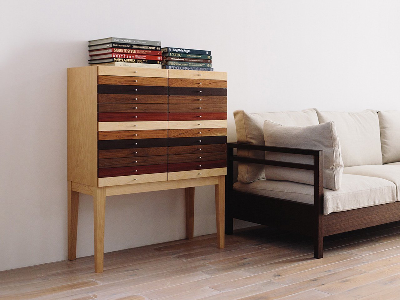 引き出しの前板は上から、メープル、チェリー、ウェンジ、ウォールナット、チーク、パドゥークの6種類の名木です。天然木のそのままの色を生かして、自然オイルで仕上げています。上から順に並べることで木味の美しさを強調したデザインになっており、シンプルなアルミの丸棒のツマミが、その美しさをさらに強調しています。