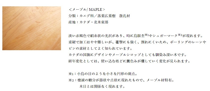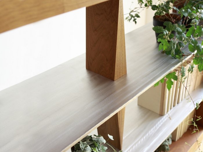 | 材質 | 本体:メープル/ウォールナット/オーク/オーク(ブラウン色)/チェリー/チーク/ウェンジ材(全てオイル仕上げ、天然木)からお選びください。 | 棚板・脚:アルミ | ※ 棚補強のための可動式シェルフサポート(3個)が付いています。 |