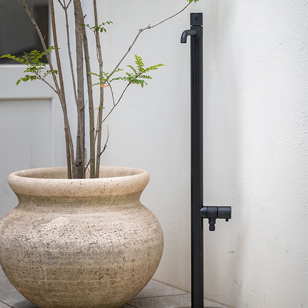 オールブラックの立水栓。 まるでインテリア水栓のような高級感のある美しいデザインが特徴です。流行に左右されない普遍的な恰好よさを追求いたしました。