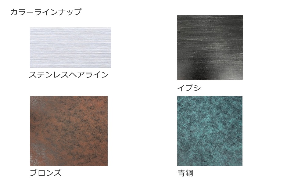 | カラーラインナップ | ステンレスヘアライン・イブシ・ブロンズ・青銅 |