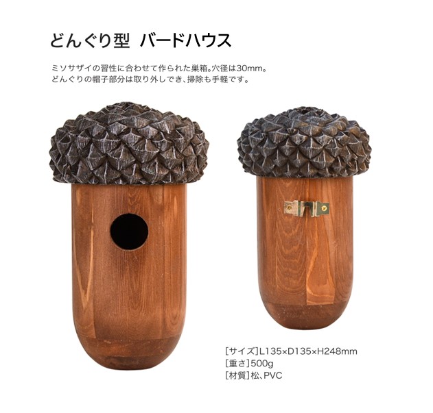 どんぐり型 バードハウス ¥6,435 (税込) 数量 カートに入れる この商品について問い合わせる 商品コード: DLD38A ブランド: FEATURE ミソサザイの習性に合わせて作られた巣箱。穴径30mmになっております。どんぐりの帽子部分は取り外しでき、掃除も手軽です。 SPEC INFORMATION 納期 一週間 サイズ L135XD135XH248mm 重量 500g 材質 松・PVC 商品お届けについて