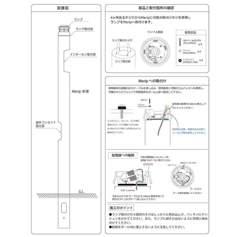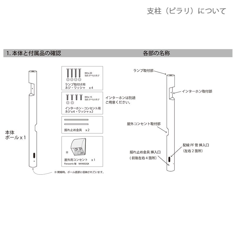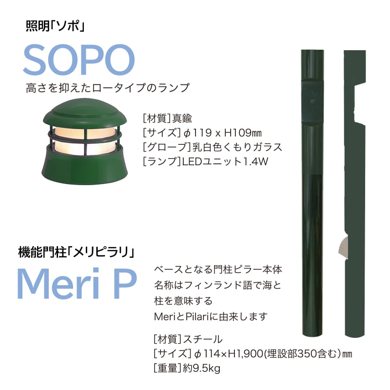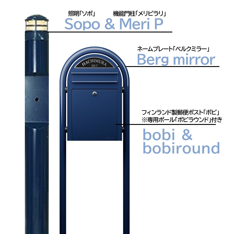 【セット内容】機能門柱「メリピラリ」、照明「ソポ」、郵便ポスト「ボビ」、ボビポスト付属ポール「ボビラウンド」、ネームプレート「ベルクミラー」