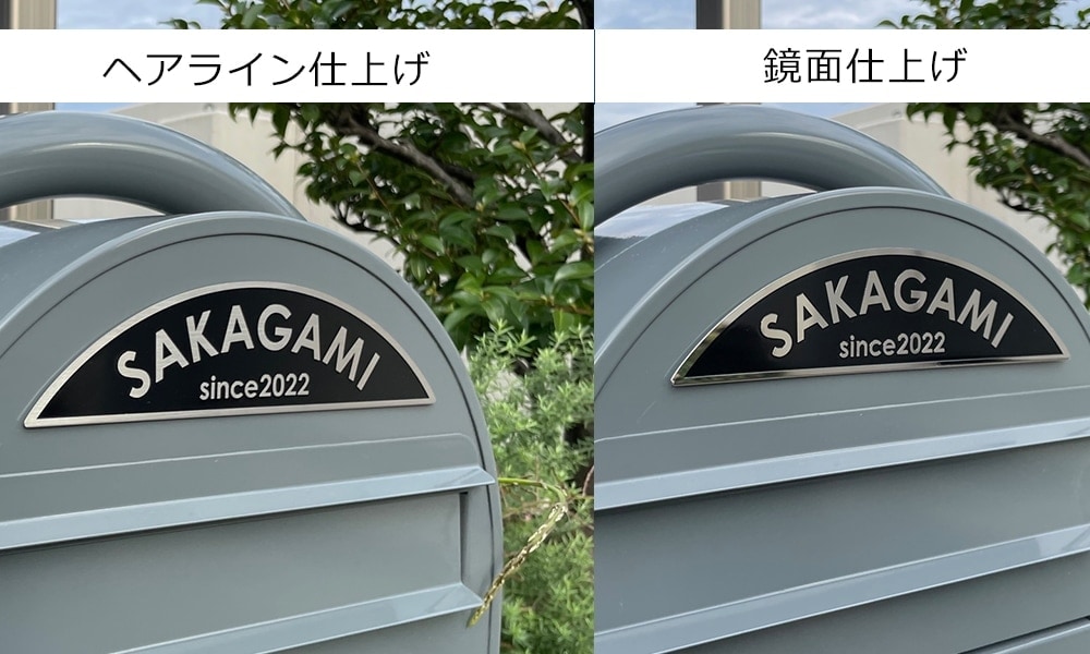 ・ネームプレートの縁まわりと文字の仕上げはヘアラインと鏡面仕上げを選択可能です。備考欄にご記入ください。