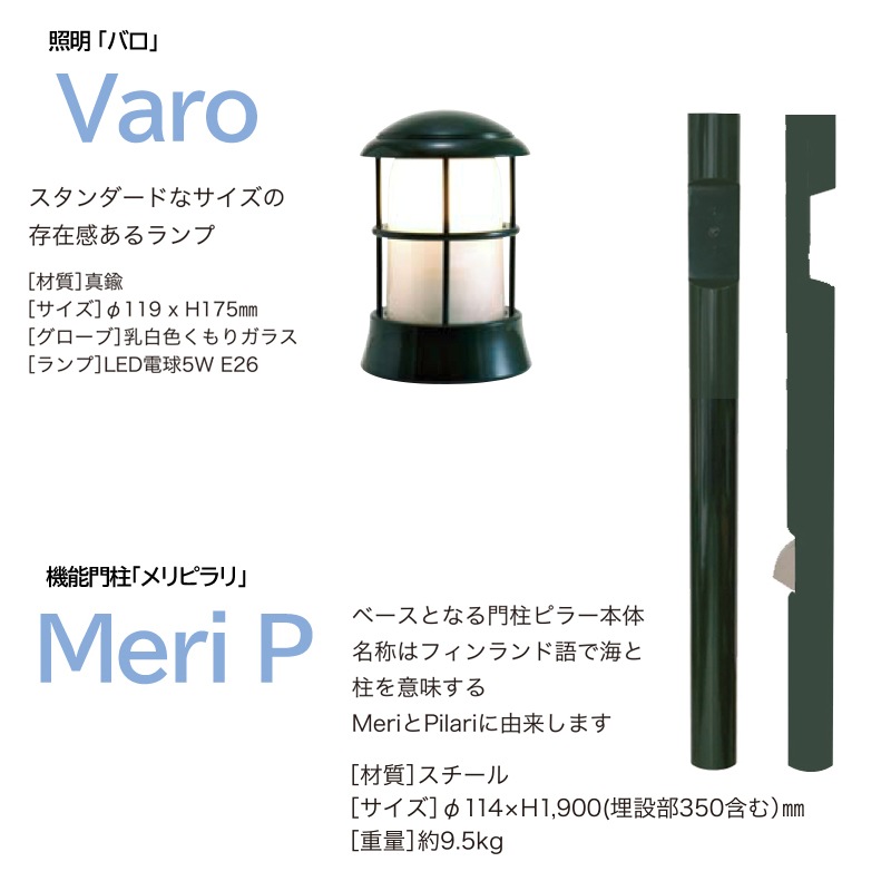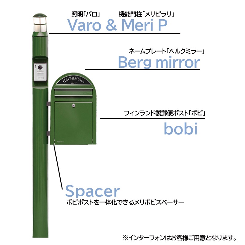 【セット内容】機能門柱「メリピラリ」、照明「バロ」、郵便ポスト「ボビ」、メリボビスペーサー、ネームプレート「ベルクミラー」