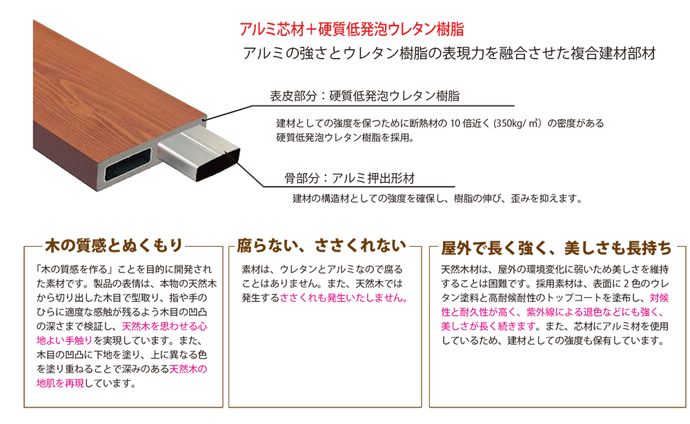 | 材質 | 人工木材(アルミ形状/硬質低発泡ウレタン樹脂) |